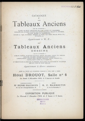 Catalogue des tableaux modernes : aquarelles, pastels, gouaches, dessins : 1. Appartenant à Monsieur B... : par Bando, Charlot, Cosson, M. Denis, Déziré, J. Flandrin [und weiteren] : 2. Appartenant à divers amateurs : Eugène Boudin, Coubine, Ch. Dufresne, R. Dufy, Favory [und weiteren] : dont la vente aux enchères publiques aura lieu à Paris, Hôtel Drouot, Salle No 11, le samedi 13 février 1932 / Alph. Bellier, commissaire-priseur ; expert Jos. Hessel