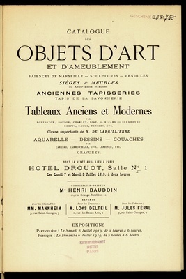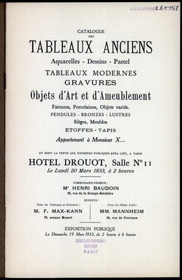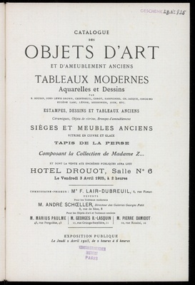 Catalogue des céramiques de la Chine : des Dynasties Ming et Tsing : plats et assiettes de la Famille Rose : belle suite de pierres dures chinoises : jades, agates, ambres, cristaux de roche : bois sculptés, vitrines d'exposition : tableaux modernes : aquarelles, pastels, dessins : par Béraud, Bonnard, Carrière, Degas, Dérain, Fantin-Latour [und weiteren] : bronze de Rodin : assiettes décorées par Vlaminck : objets d'art et d'ameublement : faïences, porcelaines, cristaux ... : dont la vente aux enchères publiques aura lieu à Paris, Hôtel Drouot, Salle No 1, les lundi 19 et mardi 20 février 1934 / commissaire-priseur: Alph. Bellier ; assité de pour les tableaux modernes: Jos. Hessel, A. Schœller, pour les objets d'art d'Extrême-Orient: André Portier, pour les objets d'art et d'ameublement: André Filsjean