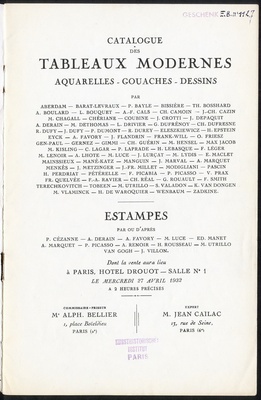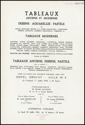 Tableaux modernes, pastels : par Céria, Corbellini, Cosson, Dumont (P.), Dupré (Jules) [und weiteren] : dessins, aquarelles, gouaches : par Beaumont (de), Chana Orloff, Ciceri, Detaille [und weiteren] : bronzes : par Bartholdi, Barye (A.L.), Puech : dont la vente aux enchères publiques aura lieu Hôtel Drouot, Salle No 9, le jeudi 8 mai 1941 / commissaire-priseur: Henri Baudoin ; expert A. Schœller