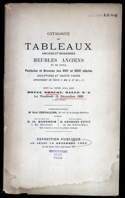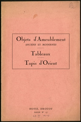 Catalogue des objets d'ameublement anciens : porcelaines et faïences anciennes : sièges et meubles, tapis d'Orient, tapisserie ancienne : appartenant à divers : tableaux modernes : par Boudin, Henner, Raffaelli, Utrillo, Vlaminck : tableaux anciens, gravures ... : dont la vente aux enchères publiques aura lieu à Paris, Hôtel Drouot, Salle No 6, le mercredi 22 avril 1942 / Me Robert Bignon, commissaire-priseur ; assisté de: Pour les meubles et objets de M.G.: MM. P. Damidot et J. Lacoste, pour les tableaux modernes M. A. Schoeller, pour le monument du costume: M. Giraud-Badin, pour les meubles et tapisseries: M. Logé
