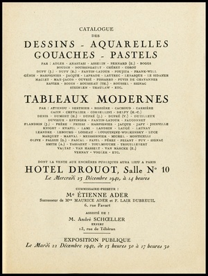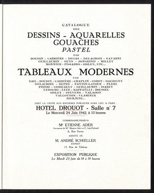 Catalogue des dessins, aquarelles, gouaches, pastels : par: Adan, Appian, Charlemagne, Chassériau, Forain, Foreau [und weitere] : tableaux modernes : par: Allègre, Bastien-Lepage, Belly, Bertin, Breton, Carrand [und weitere] : 12 œuvres d'Eugène Devéria : sculpture par Rodin : dont la vente aux enchères publiques aura lieu Hôtel Drouot, Salle No 7, le mercredi 23 juin 1943 / commissaire-priseurs Étienne Ader, successeur de Maurice Ader et F. Lair Dubreuil ; assisté de: André Schœller, expert