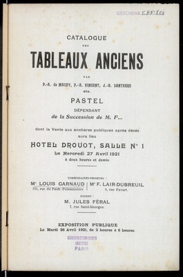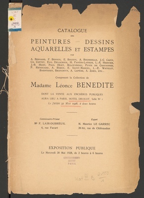 Catalogue des tableaux modernes : aquarelles, dessins : par Bail (Joseph), Boggs, (Fr.), Boudin (E.), Boulard (A.), Brissot (F.) [und weitere] : bronzes : par Barye, John-Levis Brown,Cladel, C. Maillard : provenant de la Collection de M. L. P. : dont la vente aura lieu à Paris, Hôtel Drouot, Salle No 11, le mardi 17 avril 1917 / Ch. Dubourg, commissaire-priseur ; F. Marboutin, expert
