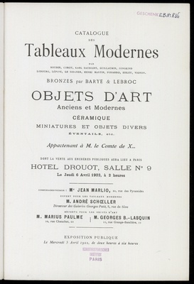 Catalogue des tableaux modernes et anciens : par Bonito, J.-L. Brown, Cals, Philippe de Champaigne, Corot [und weitere] : dessins : par Barye, Corot, Delacroix, Heim, Ingres, Millet [und weitere] : objets d'art & d'ameublement : porcelaines de Chine : sculptures, bronzes de Barye : sièges & meubles du XVIIIe siècle et autres : appartenant à Monsieur X... : et dont la vente aura lieu à Paris, Hôtel Drouot, Salle No 11, les vendredi 22 & samedi 23 mars 1918 / commissaire-priseur: Henri Mauger, suppléant Henri Baudoin ; experts pour les tableaux Durand-Ruel, pour les objets d'art M. Mannheim
