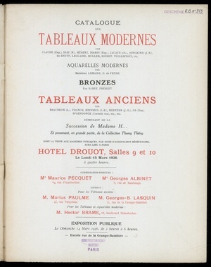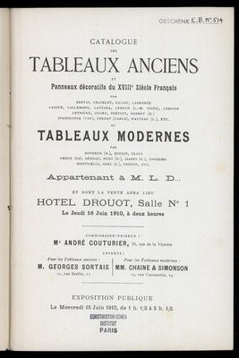 Catalogue des tableaux modernes : par Aman-Jean, Boudin, J.-L. Brown, Carrière [und weitere] : aquarelles, pastels, dessins : par Ingres, Madeleine, Lemaire, René Ménard : bronze par A. Rodin : tableaux anciens par Carriera, Ph. Champaigne, J.-B.-S. Chardin [und weitere] : dont la vente aux enchères publiques aura lieu à Paris, Galerie Georges Petit, 8, rue de Sèze, le jeudi 22 mai 1919 / commissaire-priseur Henri Baudoin ; experts pour les tableaux modernes: Georges Petit, pour les tableaux anciens: Georges Sortais
