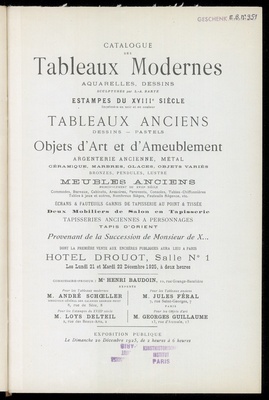 Catalogue des tableaux modernes : aquarelles, dessins : sculptures par L.-A. Barye : estampes du XVIIIe siècle : imprimées en noir et en couleur : tableaux anciens, dessins, pastels : objets d'art et d'ameublement : argenterie ancienne, métal, céramique, marbres, glaces, objets variés, bronzes, pendules, lustre : meubles anciens principalement du XVIIIe siècle .... : provenant de la succession de Monsieur de X... : dont la première vente aux enchères publiques aura lieu à Paris, Hôtel Drouot, Salle No 1, les lundi 21 et mardi 22 décembre 1925 / commissaire-priseur: Henri Baudoin ; experts pour les tableaux modernes André Schœller, pour les tableaux anciens Jules Féral, pour les estampes du XVIIIe siècle Loys Delteil, pour les objets d'art Georges Guillaume