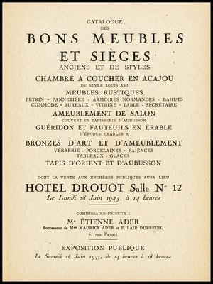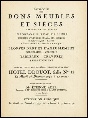 Tableaux anciens : des Écoles française, flamande et italienne : bons meubles et sièges, anciens et de styles : grand bureau plat en bois de placage orné de brozes, commode, coiffeuse, régulateur, meuble à hauteur d'appui, meubles de style Empire : bronzes d'art et d'ameublement : pendules, lustres : vente Hôtel Drouot, Salle No 6, le vendredi 1er mai 1942 / commissaire-priseur: Étienne Ader, successeur de Maurice Ader et F. Lair Dubreuil