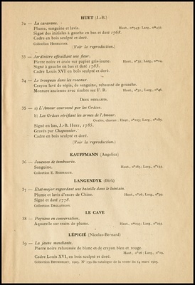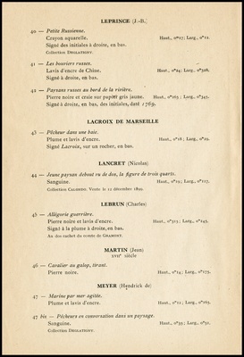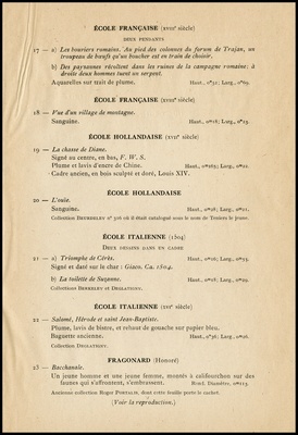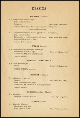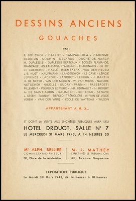 Dessins anciens : gouaches : par: F. Boucher, Callot, Campagnola, Caresme [und weitere] : appartenant à M. X... : dont la vente aux enchères publiques aura lieu Hôtel Drouot, Salle No 7, le mercredi 31 mars 1943 / Me Alph. Bellier, commissaire-priseur ; J. Mathey, expert près le Tribunal civil