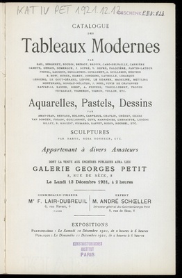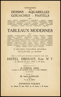 Catalogue des dessins, aquarelles, gouaches, pastels : par: Anastasi, de Beaumont, Bellangé (H.), Benassit, Cézanne [und weitere] : tableaux modernes : par: Bernard (A.), Brown (J.-L.), Carpeaux [und weitere] : sculptures : par: Barye, Carpeaux : dont la vente aux enchères publiques aura lieu à Paris, Hôtel Drouot, Salle No 10, le vendredi 8 mai 1942 / commissaire-priseur Étienne Ader, assisté de: André Schœller
