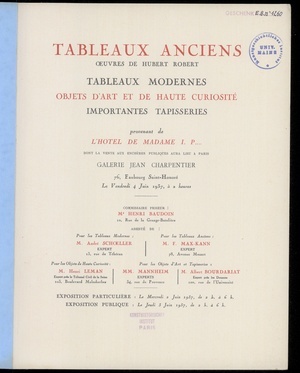 Catalogue des objets d'art et d'ameublement : faïences, boîtes, jades : sculptures, par Clodion, Marin etc. : meubles : mobiliers de Salon en ancienne tapisserie : tapisseries des Gobelins, d'Aubusson & des Flandres : tableaux anciens et modernes: par Mme Labille-Guiard, Mme Vigée-Lebrun [und weiteren] : dont la vente aura lieu à Paris, Hôtel Drouot, Salle No 6, le vendredi 29 mai 1914 / commissaire-priseur: Henri Baudoin ; experts: pour les objets d'art: M. Mannheim, pour les tableaux: Jules Féral