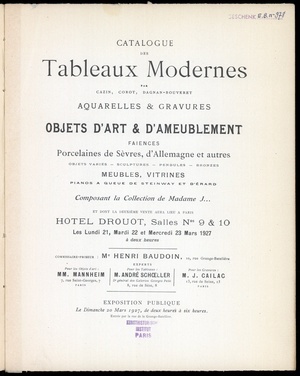 Catalogue des objets d'art et d'ameublement : faïences de Marseille, sculptures, pendules : sièges & meubles du XVIIIe siècle et autres : anciennes tapisseries : tapis de la Savonnerie : tableaux anciens et modernes: par Bonigton, Boudin, Charlet, Diaz [und weiteren] : œuvre importante de N. de Largillièrre : aquarelle, dessins, gouaches : par Caresme, Carmontelle, J.-B. Leprince, etc. : gravures : dont la vente aura lieu à Paris, Hôtel Drouot, Salle No 1, les lundi 7 et mardi 8 juillet 1919 / commissaire-priseur: Henri Baudoin ; experts: pour les objets d'art: M. Mannheim, pour les gravures: Loys Delteil, pour les tableaux: Jules Féral
