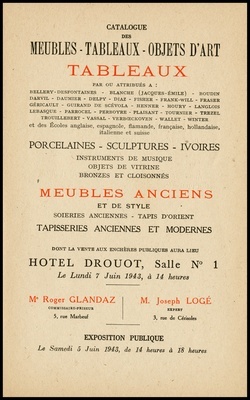 Objets d'art anciens : gravures anciennes : par ou d'après Buck, Debucourt, Fauvel, Fragonard, Hoppner, Isabey, Lawrence [und weitere] : dessins anciens : par Oudry, Hubert Robert, Gabriel de Saint-Aubin : tableaux anciens : par ou attribués à Bilcoq, Boilly, Breughel de Velours et van Balen, Broeck (V.-D.), Callet [und weitere] : porcelaines anciennes : miniatures et objets de vitrine : argenterie ancienne : bronzes anciens : pendules anciennes : sièges et meubles anciens : tapis d'Orient : Succession de Mademoiselle B***, première vente : dont la vente aux enchères publiques aura lieu Hôtel Drouot, Salle No 6, les lundi 14 et mardi 15 avril 1924 / commissaire-priseur Léon Flagel ; expert Édouard Pape