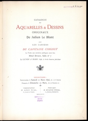 Catalogue des estampes - dessins : du XVIIIe siècle : (importants dessins du Boucher) : tableaux modernes : aquarelles, gouache, dessin : par Pierre Bonnard, Boussingault, Marc Chagall, André Derain [und weitere] : objets d'art et d'ameublement : marbre - argenterie : meubles et sièges : tapis : dont la vente aux enchères publiques aura lieu à Paris, Hôtel Drouot, Salle No 1, le lundi 5 décembre 1932 / Me Alph. Bellier, commissaire-priseur ; pour les estampes et dessins anciens: Jean Cailac, pour les tableaux modernes: MM. Bernheim Jeune, experts près la Cour d'Appel