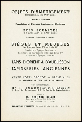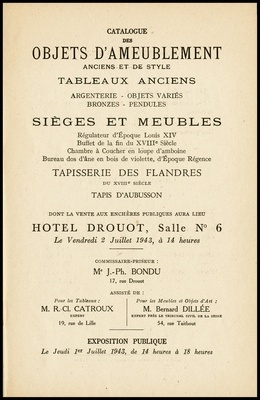 Catalogue des objets d'ameublement : anciens et de style : tableaux anciens : argenterie, objets variés, bronzes, pendules : sièges et meubles : régulateur d'époque Louis XIV, buffet de fin du XVIIIe siècle, chambre à coucher en loupe d'amboine, bureau dos d'âne en bois de violette, d'époque Régence : tapisserie des Flandres du XVIIIe siècle, tapis d'Aubusson : dont la vente aux enchères publiques aura lieu Hôtel Drouot, Salle No 6 le vendredi 2 juillet 1943 / commissaire-priseur: J.-Ph. Bondu ; assisté de: Pour les tableaux: R.Cl. Catroux, expert, pour les meubles et objets d'art: Bernard Dillée, expert près le Tribunal civil de la Seine