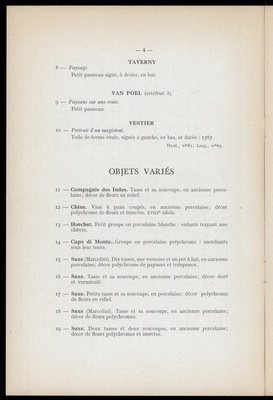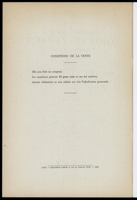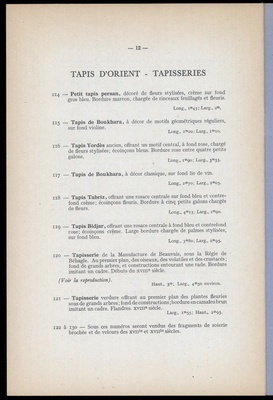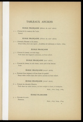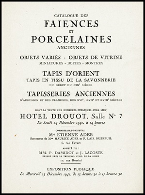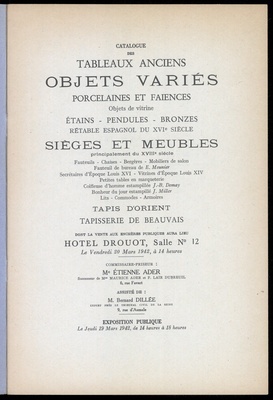 Catalogue des tableaux anciens : objets variés : porcelaines et faïences : objets de vitrine : étains, pendules, bronzes : rétable espagnol du XVIe siècle : sièges et meubles : principalement du XVIIIe siècle : fauteuils, chaises, bergères, mobliliers de salon .... : tapis d'Orient : tapisserie de Beauvais : dont la vente aux enchères publiques aura lieu Hôtel Drouot, Salle No 12 le vendredi 20 mars 1942 / commissaire-priseur: Étienne Ader, successeur de Maurice Ader et F. Lair Dubreuil ; assisté de: Bernard Dillée, expert près le Tribunal civil de la Seine