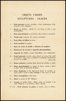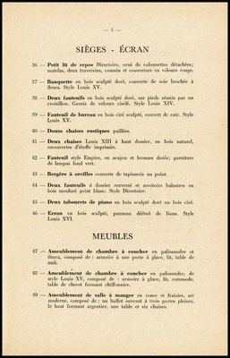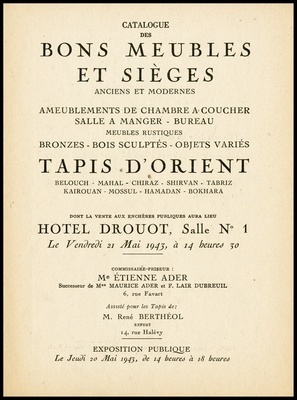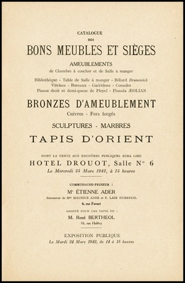 Catalogue des bons meubles et sièges : ameublements : de chambre à coucher et de salle à manger : bibliothèque, table de salle à manger, billiard Brunswick, vitrines, bureaux, guéridons, consoles, pianos droit et demi-queue de Pleyel, pianola Æolian : bronzes d'ameublement : cuivres, fers forgés : sculptures, marbres : tapis d'Orient : dont la vente aux enchères publiques aura lieu Hôtel Drouot, Salle No 6 le mercredi 25 mars 1942 / commissaire-priseur: Étienne Ader, successeur de Maurice Ader et F. Lair Dubreuil ; assisté pour les tapis de: René Berthéol