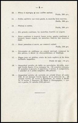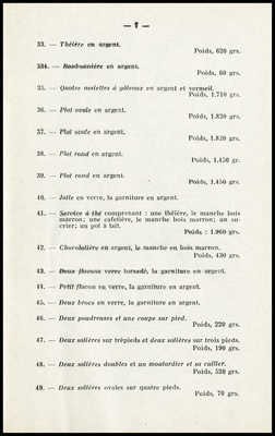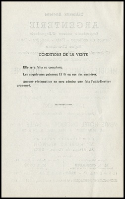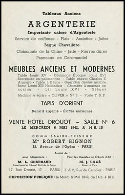 Argenterie : tableaux anciens : importante caisse d'argenterie : service de coiffeuse, plats, assiettes, jattes : bague chevalière : cloisonnés de la Chine : jade : pierres dures : panneaux en coromandel : meubles anciens et modernes : table Louis XV, commode époque Louis XVI, sécretaire en palissandre, table chevet Charles X [und weiteres] : tapis d'Orient : renard argenté, étoffes anciennes: vente Hôtel Drouot, Salle No 6 le mercredi 6 mai 1942 / commissaire-priseur Robert Bignon ; assisté de: Pour l'argenterie: L. Charraud, pour les meubles et objets d'art: J. Logé