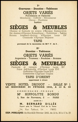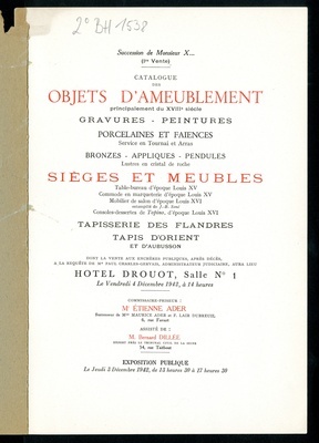 Objets d'ameublement : principalement du XVIIe et XVIIIe siècles : tableaux : faïences, porcelaines, services de table et de verrerie, bois sculptés, étains, cuivres, bronzes, garnitures de cheminée, lustres hollandais : argenterie et métal : sièges et meubles anciens et modernes : chaises d'époque Louis XIII garnies d'ancienne tapisserie, fauteuils d'époque Louis XIV [und weiteres] : cuirs de Cordoue, étoffes brodées, rideaux, garnitures de sièges en tapisserie au point : tapisseries anciennes, tapis d'Orient : vente Hôtel Drouot, Salle No 6 le mercredi 13 mai 1942 / commissaire-priseur Robert Bignon ; assisté de: Jean Thesmar
