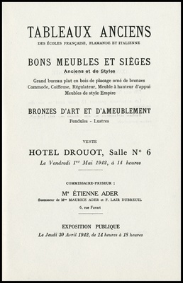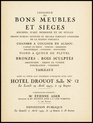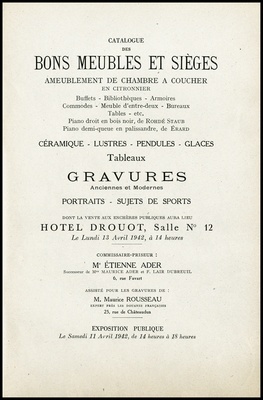 Catalogue des bons meubles et sièges : bureau en bois des îles art moderne, meuble à gravures en acajou, consoles, tables, coiffeuse, lits, cosy-corner, meubles de style anglais : piano trois quarts de queue de Philippe Hertz : piano-pianola Melodia : bronzes d'art et d'ameublement : objets variés, sculptures, glaces : porcelaines et faïences : tapis, tenture : dont la vente aux enchères publiques aura lieu Hôtel Drouot, Salle No 12 le lundi 1er juin 1942 / commissaires-priseurs: Jean Dubourg, Étienne Ader, successeur de Maurice Ader et F. Lair Dubreuil