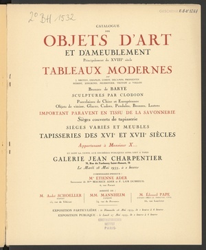 Objets de la Chine et du Japon : céramiques, bronzes, émaux : gravures, enluminures : objets de vitrine : céramiques, bronzes, étains, terre cuite, bois sculpté, verrerie : pendules, cuivres : argenterie : verseuses, huiliers, timbales, couverts : trousses de voyages : violoncelle : dentelles, tentures : vente Hôtel Drouot, Salle No 8 le lundi 8 juin 1942 / commissaire-priseur: D.H. Baudoin
