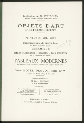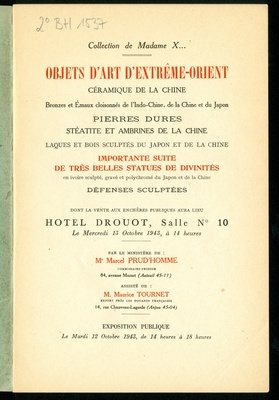 Objets d'art d'Extrême-Orient : Chine et Japon : céramique : émaux cloisonnés sur cuivre : métaux ciselés : bijoux de la Chine et de l'Indochine : pierres dures: jade, agate, quartz, etc... : bois sculptés : importante suite de statuettes et de netsukes : en ivoire sculpté du Japon : broderies sur soie : peintures : vente Hôtel Drouot, Salle No 9 le lundi 15 juin 1942 / commissaire-priseur: D.H. Baudoin ; assisté de: M. Tournet, expert près les douanes françaises