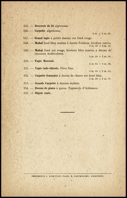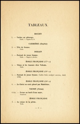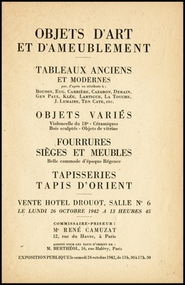 Objets d'art et d'ameublement : tableaux anciens et modernes : par, d'après, ou attribués à: Boudin, Eug., Carrière, Cazabon, Derain [und weitere] : objets variés : violoncelle du 18e, céramiques, bois sculptés, objets de vitrine : fourrures : sièges et meubles : belle commode d'époque Régence : tapisseries, tapis d'Orient : vente Hôtel Drouot, Salle No 6 le lundi 26 octobre 1942 / commissaire-priseur: René Cumuzat ; assisté pour les tapis d'Orient de: M. Berthéol, expert