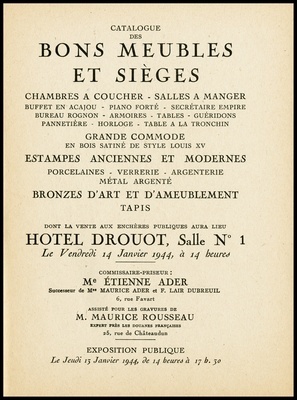 Catalogue des bons meubles et sièges : anciens et modernes : salle à manger et chambre à coucher de style moderne : armoire en laque, buffet-vaisselier, bibliothèque, secrétaire, bureau, tables, régulateur, psyché, consoles, vitrines : piano quart de queue en palissandre de Érard : clavecin, piano droit : bronzes d'art et d'ameublement : gravures des XVIIIe et XIXe siècles des Écoles française et anglaise : tableaux, aquarelles, porcelaines, tapis, tapisserie : dont la vente aux enchères publiques aura lieu Hôtel Drouot, Salle No 1 le vendredi 8 janvier 1943 / commissaire-priseur: Étienne Ader, successeur de Maurice Ader et F. Lair Dubreuil ; assisté pour les gravures de: Maurice Rousseau, expert près les douanes françaises