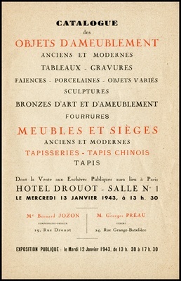 Catalogue des objets d'ameublement : anciens et modernes : tableaux, gravures : faïences, porcelaines, objets variés, sculptures : bronzes d'art et d'ameublement : fourrures : meubles et sièges : anciens et modernes : tapisseries, tapis chinois, tapis : dont la vente aux enchères publiques aura lieu à Paris, Hôtel Drouot, Salle No 1 le mercredi 13 janvier 1943 / Bernard Jozon, commissaire-priseur ; Georges Préau, expert