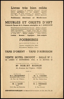 Tableaux : meubles & objets d'art : salle à manger anglaise, chambre à coucher en bois de placage style Directoire, salle à manger en noyer massif style Louis XVI, bureau, coiffeuse, meuble d'entre-deux, style Régence bois laque ivoire, important lit moderne capitonné satin rose, armoire en acajou Maison "Krieger", coiffeuse marqueterie, sièges divers : beau linge de table brodé : fourrures : argenterie, bijoux : lustres, appliques, bronzes, cartels : tapis d'Orient, tapisserie d'Aubusson : vente Hôtel Drouot, Salle No 1 le vendredi 22 janvier 1943 / commissaire-priseur Robert Bignon ; assisté de: Pour les fourrures: L. Cassier, expert près le Tribunal civil, pour les meubles et objets d'art: J. Logé, expert