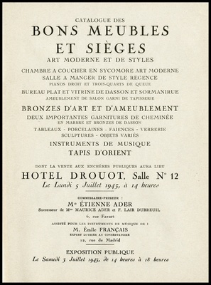 Catalogue des bons meubles et sièges : anciens et de styles : bronzes d'art et d'ameublement : tableaux, aquarelles, gravures : faïences, porcelaines, argenterie, sculptures, glaces : instruments de musique : violoncelles, violons, harpe : dont la vente aux enchères publiques aura lieu Hôtel Drouot, Salle No 6 le mercredi 3 mars 1943 / commissaire-priseur: Étienne Ader, successeur de Maurice Ader et F. Lair Dubreuil ; assisté, pour les instruments de musique de: Émile Français, expert près le Tribunal civil et les douanes