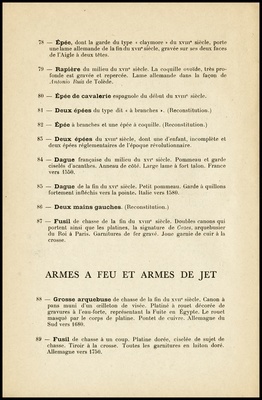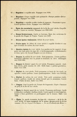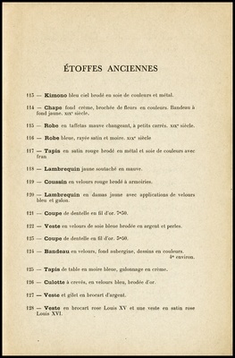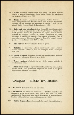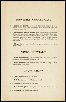 Catalogue des étoffes anciennes : velours persans du XVe siècle : armes anciennes : armes blanches, armes à feu et de jet, armes d'exécution, instruments de justice et de de torture : souvenirs napoléoniens : appartenant à divers amateurs : dont la vente aux enchères publiques aura lieu Hôtel Drouot, Salle No 10 le mercredi 14 avril 1943 / commissaire-priseur: Étienne Ader, successeur de Maurice Ader et F. Lair Dubreuil ; assisté pour les souvenirs de: L. Bourdier, expert, pour les étoffes de: J. Subert, expert près les douanes françaises, pour les armes anciennes de: Charles, expert près les douanes françaises