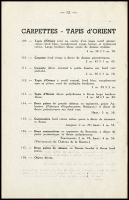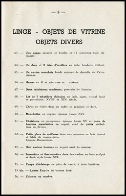 Meubles & objets d'art : tableaux, pastels, gouaches, gravures : meuble Louis XVI en acajou, meuble crédence, vitrine Louis XVI et table bois de placage ornées de bronze doré, console époque Louis XVI, bahut, bibliothèque, secrétaire, meuble étrangère chinois, chambre à coucher et salle à manger modernes, sièges divers, salon Louis XVI : salon Louis XVI couvert tapisserie d'Aubusson : canapé corbeille époque Louis XVI, bronzes, lustres, objets de vitrine : porcelaines & faïences anciennes : tapis d'Orient : tapis : cantonnières et rideaux en tapisserie d'Aubusson et de Beauvais : vente Hôtel Drouot, Salle No 1 le lundi 19 avril 1943 / commissaire-priseur Robert Bignon ; assisté de: Pour les meubles et objets d'art: J. Logé, expert