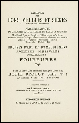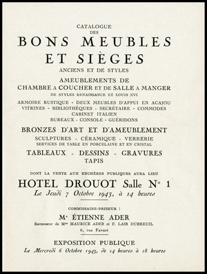 Catalogue des bons meubles et sièges : anciens, d'art moderne et de styles : grand bureau ministre et meuble formant commode de la Maison Pascault : chambre à coucher en acajou : cabinet en ébène, vitrines, dessertes, bibliothèque, commode, bonnetière : piano à queue de Pleyel : bronzes, bois sculptés : argenterie, objets de vitrine, porcelaines, verrerie : tableaux : dont la vente aux enchères publiques aura lieu Hôtel Drouot, Salle No 12 le lundi 19 avril 1943 / commissaire-priseur: Étienne Ader, successeur de Maurice Ader et F. Lair Dubreuil