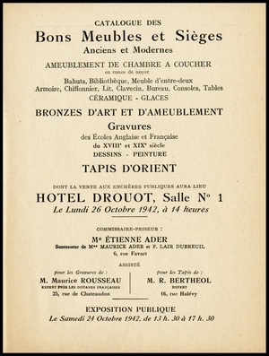 Catalogue des bons meubles et sièges : anciens et modernes : salles à manger de style Louis XVI et modernes : ameublements de bureau : commode, meubles rustiques, coffre, vaisselier, lits, bureau cylindre, table bouillotte : bronzes, bois sculptés : porcelaine, verrerie, métal argenté : très belles gravures anciennes des XVIIIe et XIXe siècles des Écoles anglaise et française : tapis, tapisseries : dont la vente aux enchères publiques aura lieu Hôtel Drouot, Salle No 1 le jeudi 6 mai 1943 / commissaire-priseur: Étienne Ader, successeur de Maurice Ader et F. Lair Dubreuil ; assisté pour les gravures de: Maurice Rousseau, expert près les douanes françaises