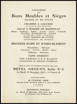 Catalogue des bons meubles et sièges : anciens et de styles : chambre à coucher en acajou de style LouisXVI : meubles rustiques : pétrin, pannetière, armoires normandes, bahuts, commode, bureaux, vitrine, table, secrétaire : ameublement de salon : couvert en tapisserie d'Aubusson : guéridon et fauteuils en érable d'époque Charles X : bronzes d'art et d'ameublement : verrerie, porcelaines, faïences, tableaux, glaces : tapis d'Orient et d'Aubusson : dont la vente aux enchères publiques aura lieu Hôtel Drouot, Salle No 12 le lundi 28 juin 1943 / commissaire-priseur: Étienne Ader, successeur de Maurice Ader et F. Lair Dubreuil