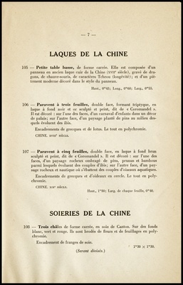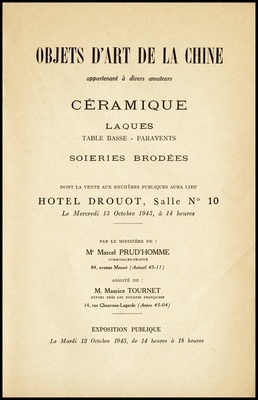Objets d'art de la Chine : appartenant à divers amateurs : céramique : laques : table basse, paravents : soieries brodées : dont la vente aux enchères publiques aura lieu Hôtel Drouot, Salle No 10 le mercredi 13 octobre 1943 / par le Ministère de: Marcel Prud'Homme, commissaire-priseur ; assisté de: Maurice Tournet, expert près les douanes françaises
