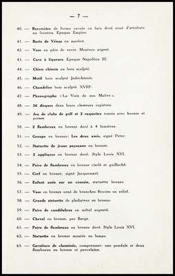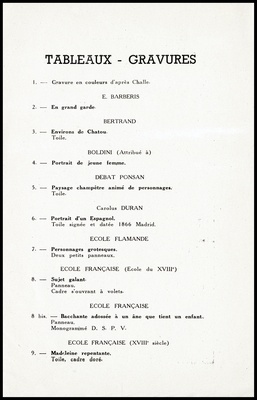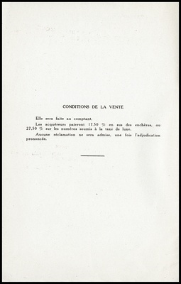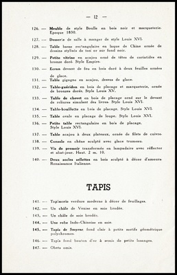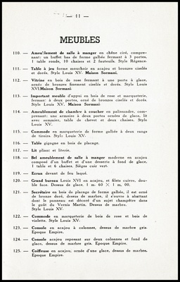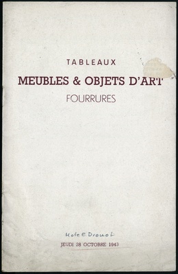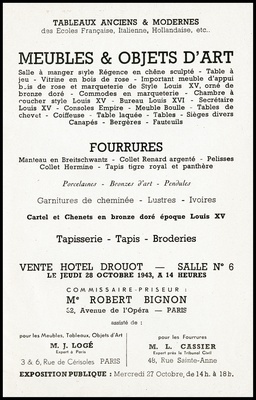 Meubles & objets d'art : tableaux anciens & modernes : des Écoles française, italienne, hollandaise etc.. : salle à manger style Régence en chêne sculpté, table à jeu, vitrine en bois de rose, important meuble d'appui bois de rose et marqueterie de style Louis XV, orné de bronze doré, commodes en marqueterie, chambre à coucher style Louis XV, bureau Louis XVI, secrétaire Louis XV, consoles Empire, meuble Boulle, tables de chevet, coiffeuse, table laquée, tables, sièges divers, canapés, bergères, fauteuils : fourrures : manteaux en breitschwantz, collet renard argenté, pelisses collet hermine, tapis tigre royal et pathère : porcelaines, bronzes d'art, pendules : garnitures de cheminée, lustres, ivoires : cartel et chenets en bronze doré époque Louis XV : tapisserie, tapis, broderies : vente Hôtel Drouot, Salle No 6 le jeudi 28 octobre 1943 / commissaire-priseur Robert Bignon ; assisté de: Pour les meubles, tableaux, objets d'art: J. Logé, expert à Paris, pour les fourrures de: L. Cassier, expert près le Tribunal civil de la Seine