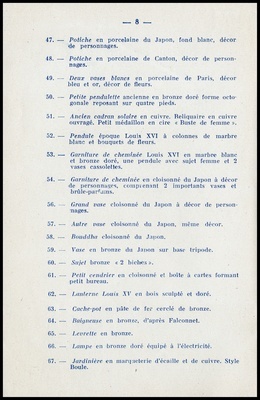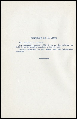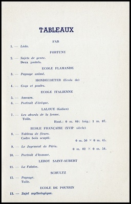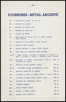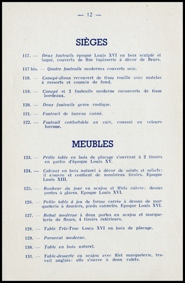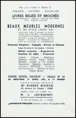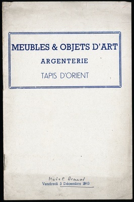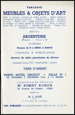 Tableaux, meubles & objets d'art : salle à manger rustique en chêne patiné, bahut moderne, commode époque Louis XV, cabinet Louis XIII, bonheur du jour, table à jeu, table tric-trac Louis XVI, chambre à coucher en hêtre patiné et marqueté, Salles à manger Louis XVI et modernes, meuble de Boulle, table à thé, canapé et divant, sièges divers : métal : argenterie : ménagère, service à thé : fourrures : bronzes de P.J. Mène et Barye : faïences & porcelaines : service de table porcelaine de Sèvres : pendule Louis XVI, pendulette, lustre : tapis d'Orient : vente Hôtel Drouot, Salle No 1 le vendredi 3 décembre 1943 / commissaire-priseur Robert Bignon ; assisté de: J. Logé, expert