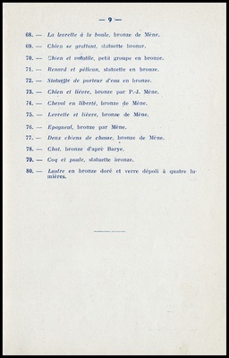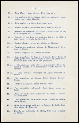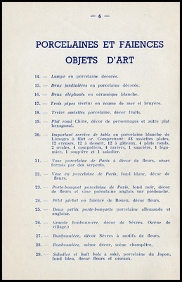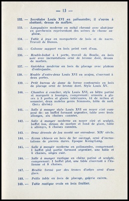Tableaux, meubles & objets d'art : salle à manger rustique en chêne patiné, bahut moderne, commode époque Louis XV, cabinet Louis XIII, bonheur du jour, table à jeu, table tric-trac Louis XVI, chambre à coucher en hêtre patiné et marqueté, Salles à manger Louis XVI et modernes, meuble de Boulle, table à thé, canapé et divant, sièges divers : métal : argenterie : ménagère, service à thé : fourrures : bronzes de P.J. Mène et Barye : faïences & porcelaines : service de table porcelaine de Sèvres : pendule Louis XVI, pendulette, lustre : tapis d'Orient : vente Hôtel Drouot, Salle No 1 le vendredi 3 décembre 1943 / commissaire-priseur Robert Bignon ; assisté de: J. Logé, expert