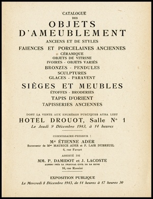 Objets d'ameublement : principalement du XVIIIe siècle : céramique : porcelaines et faïences anciennes : objets variés, bronzes, pendules, sculptures, baromètres : meubles : tapis : appartenant à Monsieur X... : dont la vente aux enchères publiques aura lieu Hôtel Drouot, Salle No 1 le jeudi 20 janvier 1944 / commissaires-priseurs: Maurice Carpentier, Étienne Ader, successeur de Maurice Ader et F. Lair Dubreuil ; assisté de: P. Damidot et J. Lacoste, expert près le Tribunal civil de la Seine
