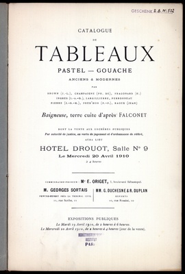 Catalogue de tableaux : pastel, gouache : anciens & modernes : par Brown (J.-L.), Champaigne (Ph. de), Fragonard (H.) [und weiteren] : Baigneuse, terre cuite d'après Falconet : dont la vente aux enchères publiques, par autorité de justice, en vertu de jugement et d'ordonnance de référé aura lieu Hôtel Drouot, Salle No 9 le mercredi 20 avril 1910 / commissaire-priseur E. Origet ; Georges Sortais, expert-peintre près le tribunual civil, G. Duchesne & R. Duplan, experts