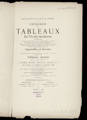Catalogue des tableaux anciens et modernes : par Baron, E. de Beaumont, Rosa Bonheur, F. Bonvin, Brakenburg [und weiteren] : aquarelles, dessins, pastels : par Baltard, Bertoli, van Blœmen, Rosa Bonheur, Dauzats [und weiteren] : dont la vente aux enchères publiques aura lieu, à Paris Hôtel Drouot, Salle No 1, le mercredi 18 mai 1910 / Henri Baudoin, commissaire-priseur, successeur de Paul Chevallier ; G. Sortais & P. Simons, experts près le Tribunual civil de la Seine