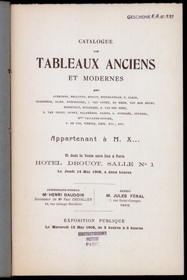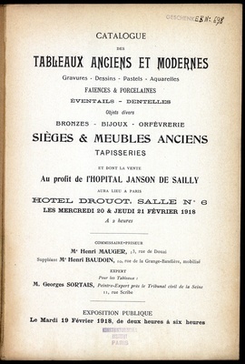 Catalogue des tableaux et dessins anciens et modernes : par Bernier, Courbet, Delacroix (Eugène) [und weiteren] : buste de Saint Jean : en marbre du XVIIIe siècle : appartenant à Mme M*** et à divers : dont la vente aux enchères publiques aura lieu à Paris, Hôtel Drouot, Salle No 6, le samedi 30 mars 1918 / commissaire-priseur: Henri Mauger, suppléant Henri Baudoin ; expert Georges Sortais, peintre-expert près le Tribunual civil de la Seine