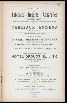 Tableaux anciens et modernes : dessins, aquarelles, pastels : par Boggs, Bonnard, Brown (J.L.), Flers, Frank-Will, Harpignies [und weiteren] : tableaux modernes : par Anastasi, Barye, Benassit, Chaigneau, Chintreuil, Cosson, Damoye [und weiteren] : palettes des peintres: Berne-Bellecour, Toudouze, Puvis de Chavannes : sculpture par Desbois : tableaux anciens, dessins, pastels : par, ou attribués à: Breughel (Jean), Cuyp (Albert), Cuyp (Benjamin), Eeckhout, Goltzius (Hendrich) [und weiteren] : dont la vente aux enchères publiques aura lieu Hôtel Drouot, Salle No 8, le vendredi 11 juillet 1941 / commissaire-priseur: Henri Baudoin ; assiste de: Pour les tableaux modernes André Schœller, expert, pour les tableaux anciens Georges Terrisse, expert