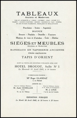Tableaux anciens et modernes : par ou attribués à: Adam, Barré, H. Bellangé [und weitere] et des Écoles française, hollandaise, italienne, des XVIIe, XVIIIe et XIXe siècles : meubles et sièges : important meuble portugais, armoire normande, secrétaire, commode, console et guéridon, époque Empire [und weiteres] : faïences et porcelaines anciennes : bronzes, lustres, appliques : fourrures : tapis d'Orient et d'Aubusson : vente Hôtel Drouot, Salle No 1 le vendredi 6 novembre 1942 / commissaire-priseur Robert Bignon ; assisté de: Pour les tableaux et les meubles, J. Logé, J. Thesmar, pour les fourrures, L. Cassier, expert près le Tribunal civil de la Seine