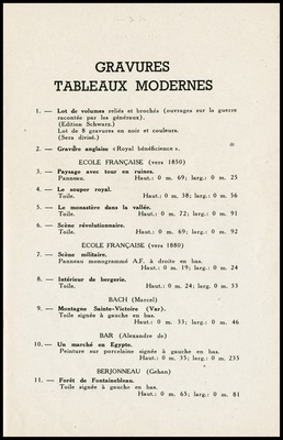 Tableaux anciens & modernes : par ou attribués à: Marcel Bach, de Bar, Berjonneau, A. Charpin, B. Constant, Corot [und weitere] et des Écoles flamande et française : œuvres de Guirand de Scevola : meubles & objets d'art : table bureau Louis XV, table bureau moderne, secrétaire Louis Philippe, commode Louis XIV, table tric-trac, ameublements de chambres à coucher Louis XVI et moderne, salles à manger Louis XVI en noyer sculpté [und weiteres] : commode en bois de placage époque Louis XIV, salon Louis XVI couvert tapisserie d'Aubusson : piano 1/2 queue Erard : argenterie, bijoux, faïences & porcelaines : brozes, cristaux, service de table : pendule époque Louis XVI, cave à liqueurs en marqueterie de Boulle : tapis d'Orient & d'Aubusson : vente Hôtel Drouot, Salle No 12 le lundi 31 mai 1943 / commissaire-priseur Robert Bignon ; assisté de: Pour les meubles & objets d'art, J. Logé, expert, pour les tableaux et tapis, J. Thesmar, expert