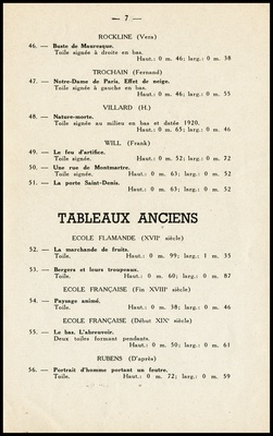 Tableaux anciens & modernes : meubles & objets d'ameublements : salle à manger moderne en bois de placage, crédence gothique, commode Louis XVI en acajou, commode bois de placage, secrétaire Empire, coffre-fort "Petitjean", bibliothèque Louis XVI en acajou, tables, guéridons, paravents, sièges : bronzes, porcelaines et faïences : argenterie, bijoux : fourrures : tapis d'Orient, cantonnière en ancienne tapisserie d'Aubusson, broderies : vente Hôtel Drouot, Salle No 6 le lundi 7 décembre 1942 / commissaire-priseur Robert Bignon ; assisté de: Pour les tableaux et les meubles, J. Logé, J. Thesmar, pour les fourrures, L. Cassier, expert près le Tribunal civil de la Seine