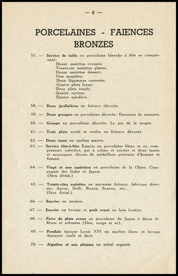 Tableaux, meubles & objets d'art : salle à manger rustique en chêne patiné, bahut moderne, commode époque Louis XV, cabinet Louis XIII, bonheur du jour, table à jeu, table tric-trac Louis XVI, chambre à coucher en hêtre patiné et marqueté, Salles à manger Louis XVI et modernes, meuble de Boulle, table à thé, canapé et divant, sièges divers : métal : argenterie : ménagère, service à thé : fourrures : bronzes de P.J. Mène et Barye : faïences & porcelaines : service de table porcelaine de Sèvres : pendule Louis XVI, pendulette, lustre : tapis d'Orient : vente Hôtel Drouot, Salle No 1 le vendredi 3 décembre 1943 / commissaire-priseur Robert Bignon ; assisté de: J. Logé, expert