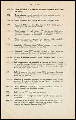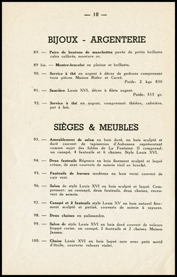 Tableaux anciens et modernes : meubles et objets d'ameublement : commodes, bonheur du jour, bureaux cylindre en bois de placage et acajou, commodes rustiques du XVIIIe siècle, bureau ministre, salle à manger et chambre à coucher modernes en noyer massif, bibliothèque, meuble en laque : sièges des époques Louis XIV, Louis XV, Louis XVI et Directoire : argenterie, coffre de la Maison Odiot, porcelaine et faïences anciennes, bronzes, objets de vitrinee, appliques : fourrures : manteau en astrakan, mantelet en renard argenté, hermine, zibeline : tapis d'Orient, tapis d'Aubusson, tapisseries anciennes : vente Hôtel Drouot, Salle No 6 le vendredi 19 juin 1942 / commissaire-priseur Robert Bignon ; assisté de: Pour les fourrures: L. Cassier, expert près le Tribunal civil, pour les meubles et tapisseries: J. Logé, expert