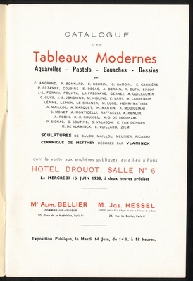 Catalogue des tableaux modernes : aquarelles, pastels, gouaches, dessins : par P. Bonnard, G. Braque, J. Capon, E. Carrière [und weiteren] : dessin sur Platre par Steinlen, livres : provenant de la collection de M. E. B... : dont la vente aux enchères publiques aura lieu à Paris, Hôtel Drouot, Salle No 6, le samedi 18 novembre 1933 / commissaire-priseur: Alph. Bellier ; experts Jos. Hessel, expert près la Cour d'Appel, MM. Bernheim-Jeune, experts près la Cour d'Appel