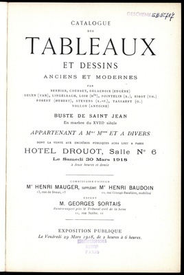 Catalogue des tableaux et dessins anciens et modernes : par Bernier, Courbet, Delacroix (Eugène) [und weiteren] : buste de Saint Jean : en marbre du XVIIIe siècle : appartenant à Mme M*** et à divers : dont la vente aux enchères publiques aura lieu à Paris, Hôtel Drouot, Salle No 6, le samedi 30 mars 1918 / commissaire-priseur: Henri Mauger, suppléant Henri Baudoin ; expert Georges Sortais, peintre-expert près le Tribunual civil de la Seine